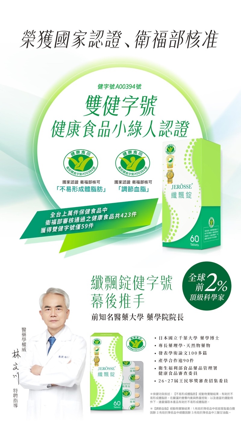 (保健功效敘述:經動物實驗結果,有助於不易形成體脂肪。在嚴謹的營養均衡與熱量控制,以及適當的運動條件下,適量攝取本產品有助於不易形成體脂肪。)
