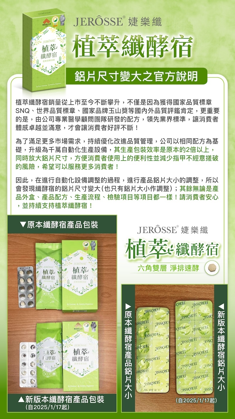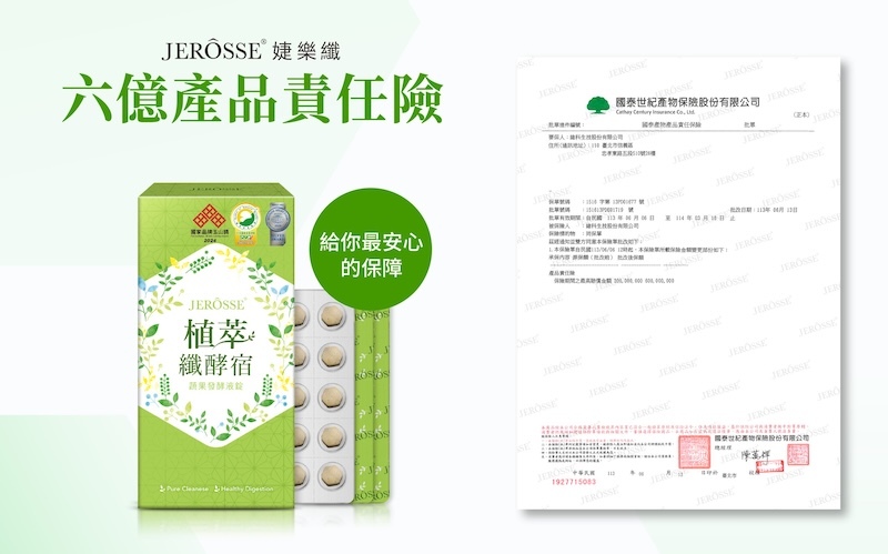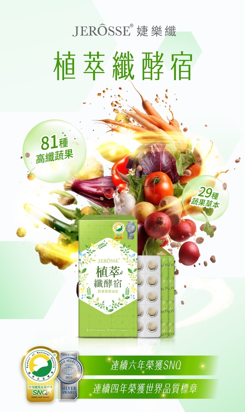 「JEROSSE 婕樂纖 植萃纖酵宿/纖酵宿」,是一款含多種專利高纖蔬果萃取成分的保健食品,通過SGS多項檢測合格,全成分皆與國內外知名大廠合作,多國專利認證原料安全有保障,並獲得世界品質標章肯定!